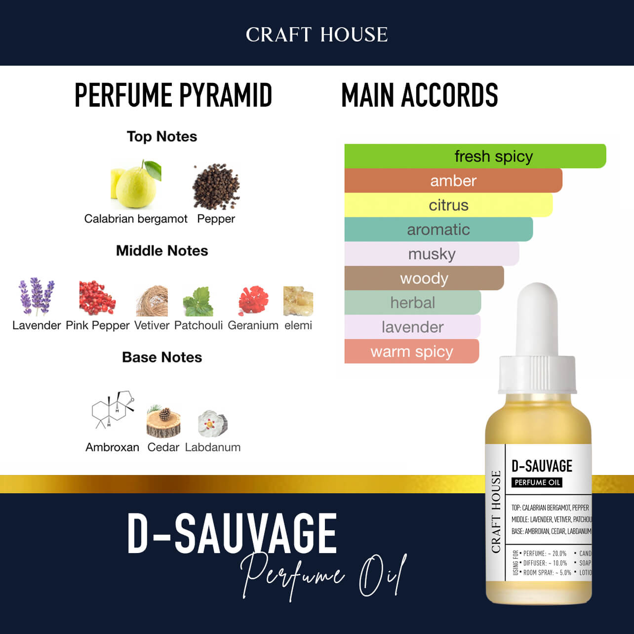 Lấy cảm hứng từ biểu tượng D Sauvage, mùi hương này mở đầu bằng sự bùng nổ của cam bergamot tươi mát hòa quyện với tiêu cay, mang lại cảm giác mạnh mẽ và sảng khoái. Lớp hương giữa là sự kết hợp của oải hương, tiêu hồng và phong lữ, tạo nên chiều sâu nam tính, hiện đại. Kết thúc với tầng hương nền từ ambroxan, cỏ hương bài và gỗ tuyết tùng – mạnh mẽ, bền bỉ và đầy cuốn hút.